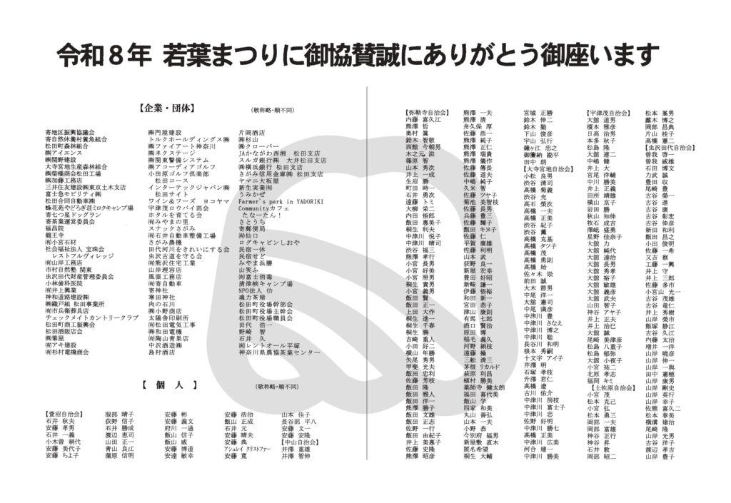 | 🍃イベントスケジュール 🍃 9:30~ 物産展 9:30~ 寄祭囃子 10:00~ 大会式典 10:30~ 胡蝶連 よさこい新舞踊 10:45~ KAZUOバンド 11:20~ 花川由香ショー 11:50~ 北川大介ショー 13:00~ 🐟川魚つかみ取り(1回目) ※小学3年生~6年生 13:00~ (ステージ準備) 13:05~ Lena Osako ピアノ弾き語り 13:30~ 立花学園吹奏楽部 13:45~ 🐟川魚つかみ取り(2回目) ※園児~小学3年生 14:05~ 立花学園チアリーディング 14:25~ ジージーズ(ロック) 15:00 終了 ※イベントの時間・内容は予告なく変更する場合があります |